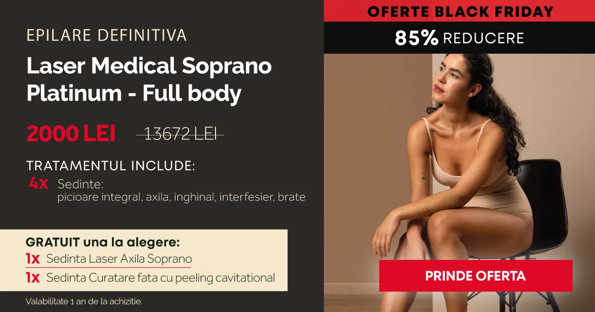 / Epilare definitiva cu laser medical Soprano Platinum – Full Body – 4 sedinte laser: picioare integral, axila, inghinal, interfesier, brate